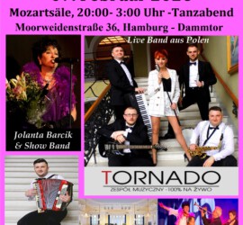 Wie jedes Jahr laden wir Sie herzlich zur Jolanta Barcik GALA SHOW 2026, die am 7. Februar ab 20.00 Uhr in den Mozartsälen stattfindet. Wir fangen den Abend mit der Polonaise an, dem traditionllen polnischen Hoftanz, in dem auch Sie mittanzen dürfen. Jolanta Barcik, die bekannte polnische Sängerin bringt zusammen mit der Show Band, die Gäste in die beste Stimmung! Bis 3:00 Uhr wird die in Polen bekannte und geschätzte Live Band „TORNADO“ die Gäste zum Tanzen mitnehmen. Die Top-Musiker mit temperamentvollenvoller Sängerin Dominika, werden die besten Songs der 60-80-er, und die aktuellen Hits spielen. Das Restaurant wird die Gäste a´la carte mit Speisen und Getränken bedienen. Reservierung und Verkauf unter Tel. 017648869412. Bitte buchen Sie frühzeitig, da die Plätze begrenzt sind. Eintritt nur in Abendgarderobe.